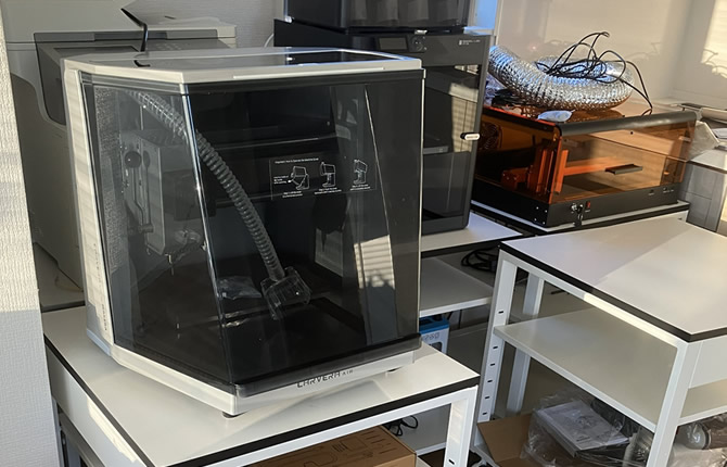 3Dプリンター(Bambu Lab P1S Combo ほか)、レーザーカッター・彫刻機(ATOMSTACK A24 Ultra 24W)、CNC卓上フライス盤(Carvera Air 12月に導入)、卓上ボール盤・・・